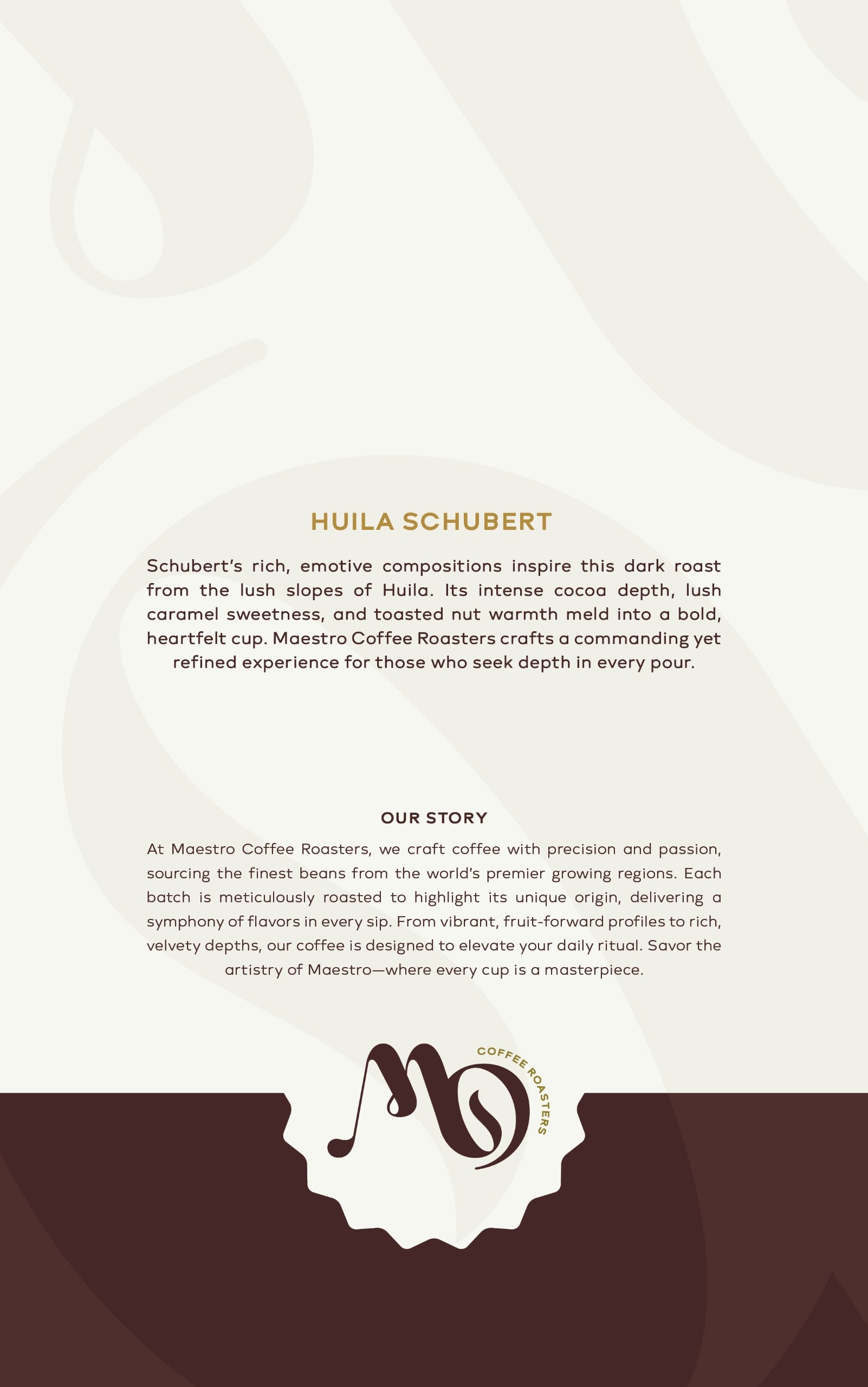 Huila Schubert - Schubert’s rich, emotive compositions inspire this dark roast from the lush slopes of Huila. Its intense cocoa depth, lush caramel sweetness, and toasted nut warmth meld into a bold, heartfelt cup. Maestro Coffee Roasters crafts a commanding yet refined experience for those who seek depth in every pour.