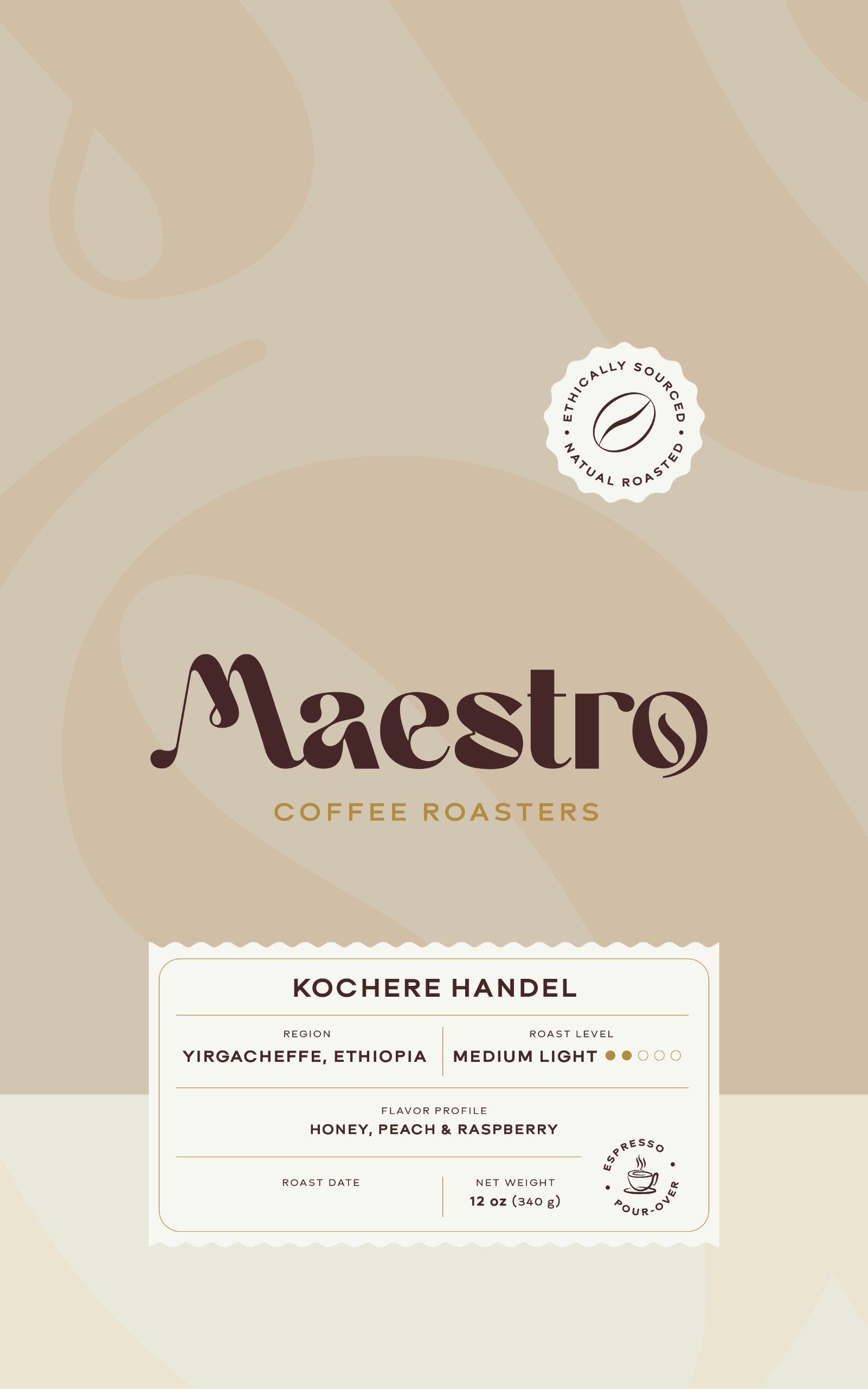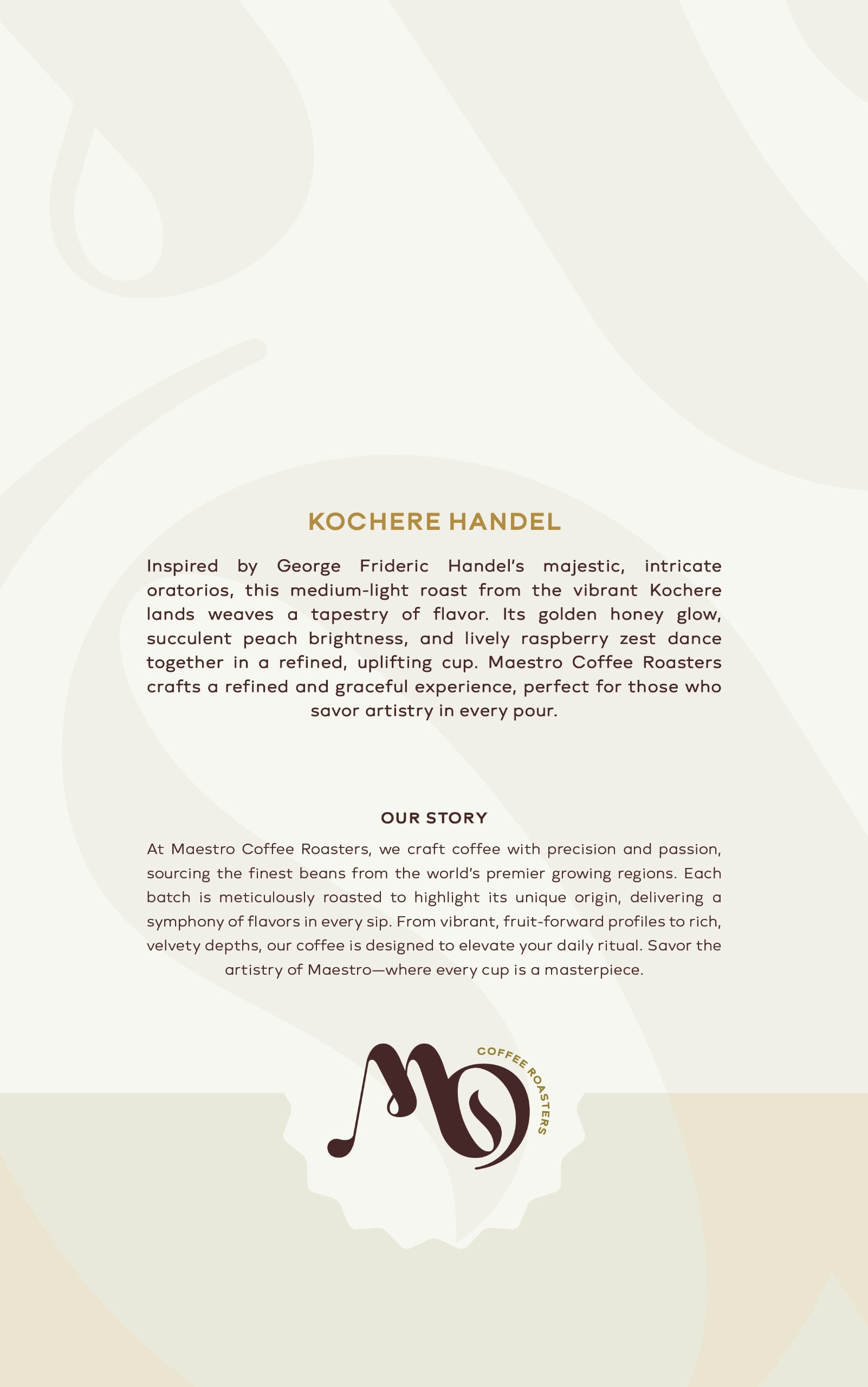 Kochere Handel - Inspired by George Frideric Handel’s majestic, intricate oratorios, this medium-light roast from the vibrant Kochere lands weaves a tapestry of flavor. Its golden honey glow, succulent peach brightness, and lively raspberry zest dance together in a refined, uplifting cup. Maestro Coffee Roasters crafts a refined and graceful experience, perfect for those who savor artistry in every pour.